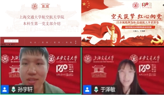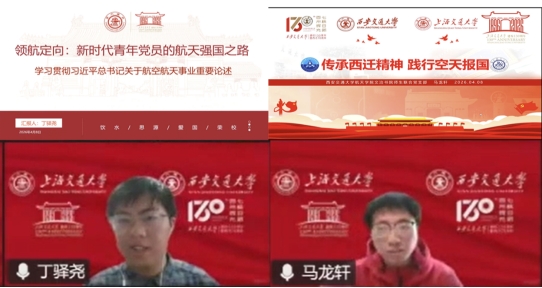 正值西安交通大学及上海交通大学130周年校庆到来之际,近日,西安交大航天航空学院联合上海交大航空航天学院以“百卅弦歌传薪火,双交空天践初心”为主题线上开展建校130周年党支部主题党日活动。上海交通大学航空航天学院党委委员沈强副教授,团委书记高瑾,西安交大航天航空学院院长助理、党支部指导教师王正锦教授,党委组织员陆天舒,以及两校党支部近80名师生参与。活动由上海交大航空航天学院本科生第一党支部书记孙宇轩、西安交大航天学院文治书院师生联合党支部书记于泽敏联合主持。