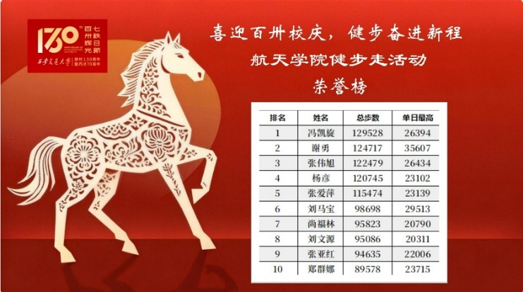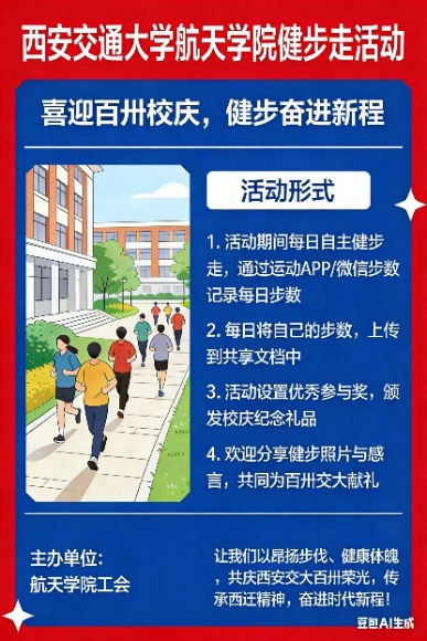 为热烈庆祝西安交通大学130周年华诞暨迁校70周年,传承弘扬西迁精神,近日,航天航空学院举办“喜迎百卅校庆,健步奋进新程”主题线上健步走活动。本次活动由学院工会牵头策划组织,创新引入AI技术赋能全流程,从宣传推广到数据统计,全方位展现了“科技+人文”深度融合的创新实践。活动吸引学院百余位教职工积极参与,累计产生百余条有效步数记录。