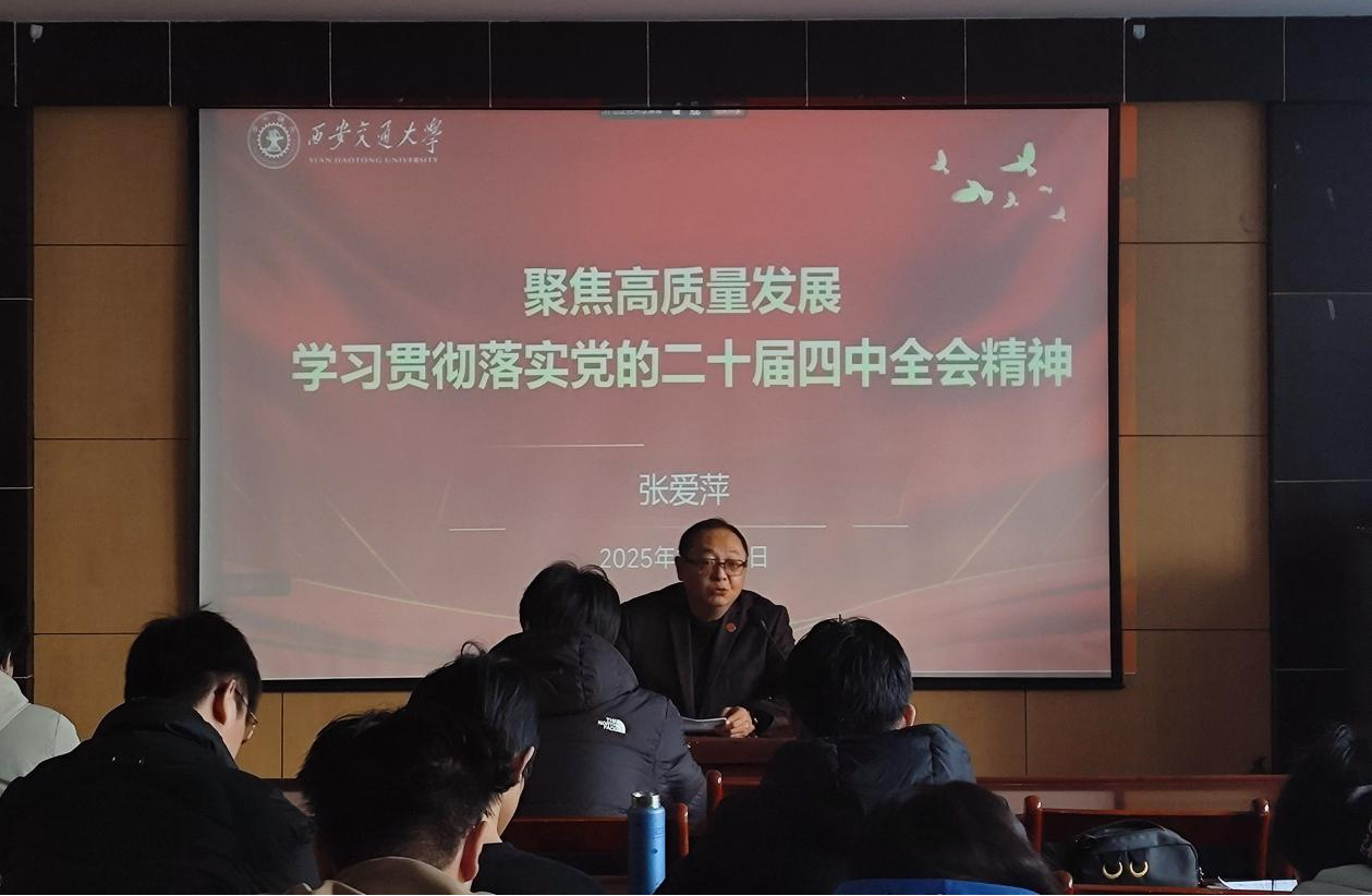 为学习宣传贯彻党的二十届四中全会精神,按照学校党委统一部署,12月24日下午,航天航空学院党委书记张爱萍以“聚焦高质量发展,学习贯彻落实党的二十届四中全会精神”为题开展宣讲,同期为师生讲授党的二十届四中全会专题党课。100余名师生现场参加学习。党课由学院党委组织员陆天舒主持。