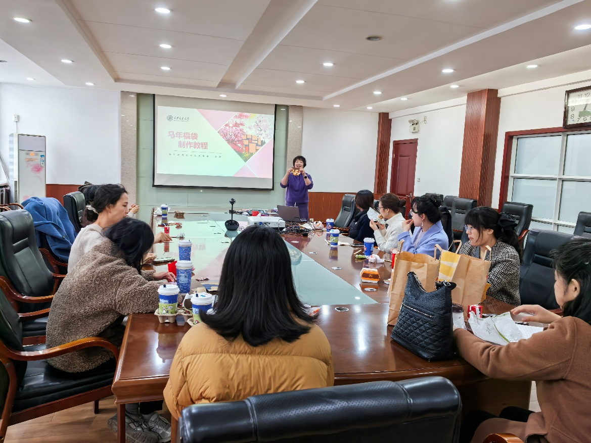 活动伊始,学院工会副主席黄莺老师带来“马年福袋制作教程”专题分享。她结合投影展示的精美福袋设计图,从面料选择、裁剪技巧,到缝制针法、装饰细节,一步步拆解制作流程,生动讲解传统布艺手工的精髓。黄老师还手持成品福袋现场演示,灵动的针法、精巧的纹样瞬间点燃了大家的创作热情,不少参与者拿出手机记录关键步骤,生怕错过细节。