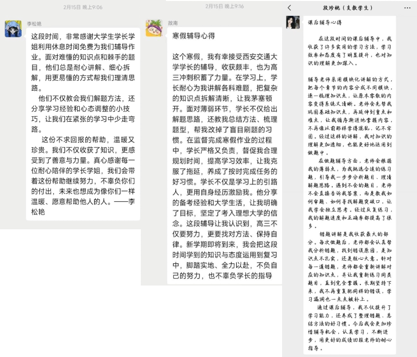 面对高三学子的备考压力,志愿者们结合自身经历分享心态调节方法,耐心安抚情绪,帮助树立信心。活动得到施甸一中师生高度认可,学子们纷纷表示收获颇丰:蒋新纯称赞辅导化繁为简,掌握了应试技巧;陈筱感言学姐的分享缓解了焦虑,明确了备考方向;陈加航表示克服了畏难情绪,养成了良好学习习惯。