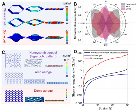 The dome-celled aerogels prepared maintain 99% elastic strain across a wide temperature range (4.2 K to 2273 K) and after 100 repeated thermal shocks. Multiscale mechanical modeling revealed that the dome’s non-developable curved surface forms a dense, uniform wrinkle network under compression. This reduces rebound adhesion resistance, enhances elastic strain energy storage (an order of magnitude higher than honeycomb/arch structures), and avoids local strain concentration—ensuring stability in extreme thermomechanical environments.