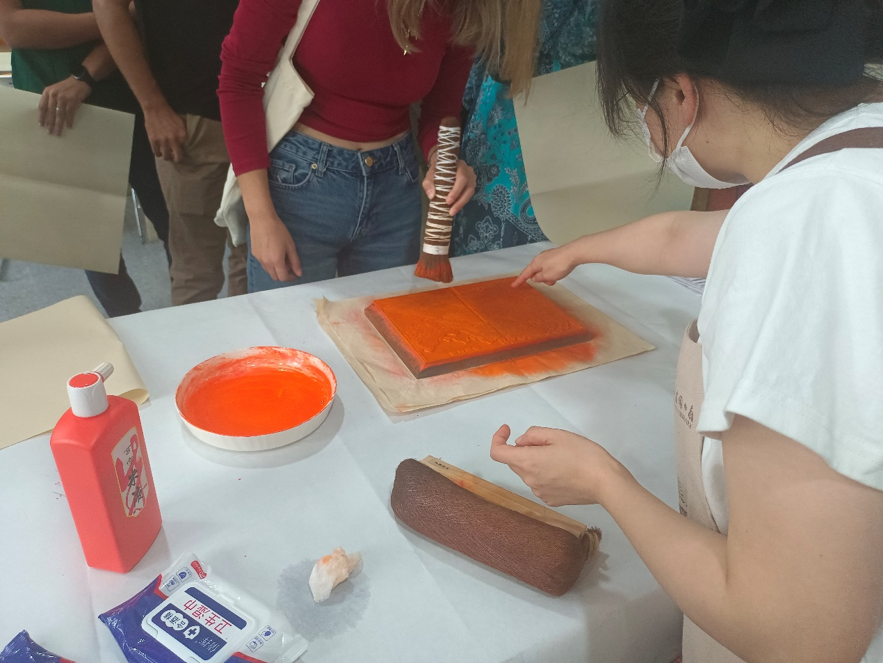 同学们依次上前动手操作。起初大家小心翼翼,但逐渐在实践中找到节奏:刷墨的方向、按压的力道、宣纸的铺放都需要细致斟酌。随着一幅幅印刷作品显现,现场不时响起轻轻的惊叹声。“原来看似简单的刷墨和拓印,要做好并不容易。”“古人一刀一笔刻版,一刷一印传书,真是耐心与智慧的结晶。”不少同学在完成作品后都露出了满足的笑容。
