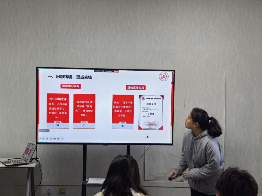 提问互动环节,评审团同志围绕党的基本知识展开提问,问题涵盖党的廉洁建设、党章基本规定以及党的最新理论成果等内容。面对提问,入党积极分子们沉着应对、条理清晰,展现出扎实的理论功底。对于个别回答不够完善的同学,评审团同志耐心引导,既指出不足,又给予鼓励,帮助其进一步深化对党的认识,充分体现了党支部“培养教育与考察把关并重”的工作原则。